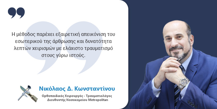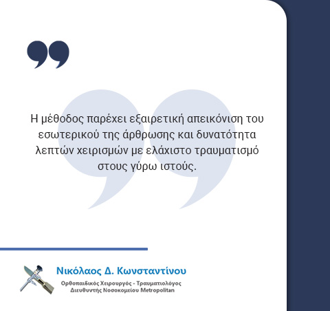 Παράλληλα, μέσω ειδικών μικροεργαλείων, ο χειρουργός μπορεί να προβεί σε στοχευμένες επεμβάσεις με απόλυτη ακρίβεια. Η μέθοδος παρέχει εξαιρετική απεικόνιση του εσωτερικού της άρθρωσης και δυνατότητα λεπτών χειρισμών με ελάχιστο τραυματισμό στους γύρω ιστούς. Όλα αυτά καθιστούν την ανάρρωση ταχύτερη, ο μετεγχειρητικός πόνος είναι ελάχιστος και ο κίνδυνος επιπλοκών είναι μικρότερος σε σύγκριση με τις παραδοσιακές ανοικτές τεχνικές.