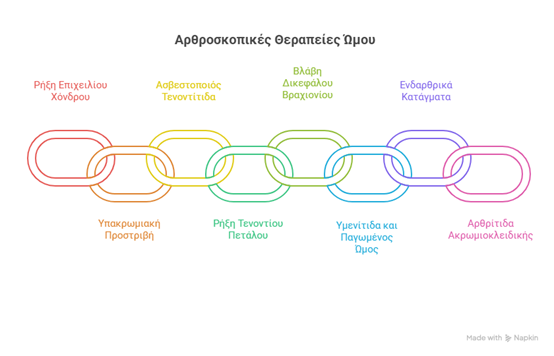 - Αρθρίτιδα ακρωμιοκλειδικής: Αντιμετωπίζεται με εκτομή οστεοφύτων και αρθριτικού χόνδρου, με στόχο την ανακούφιση από τον πόνο.