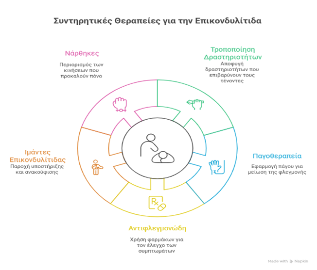 Οι περισσότεροι ασθενείς με επικονδυλίτιδα έξω ή έσω βελτιώνονται με τη συντηρητική θεραπεία. Η προσέγγιση της συντηρητικής θεραπείας στοχεύει στη μείωση του πόνου και στη σταδιακή ενίσχυση των μυών του αντιβραχίου.